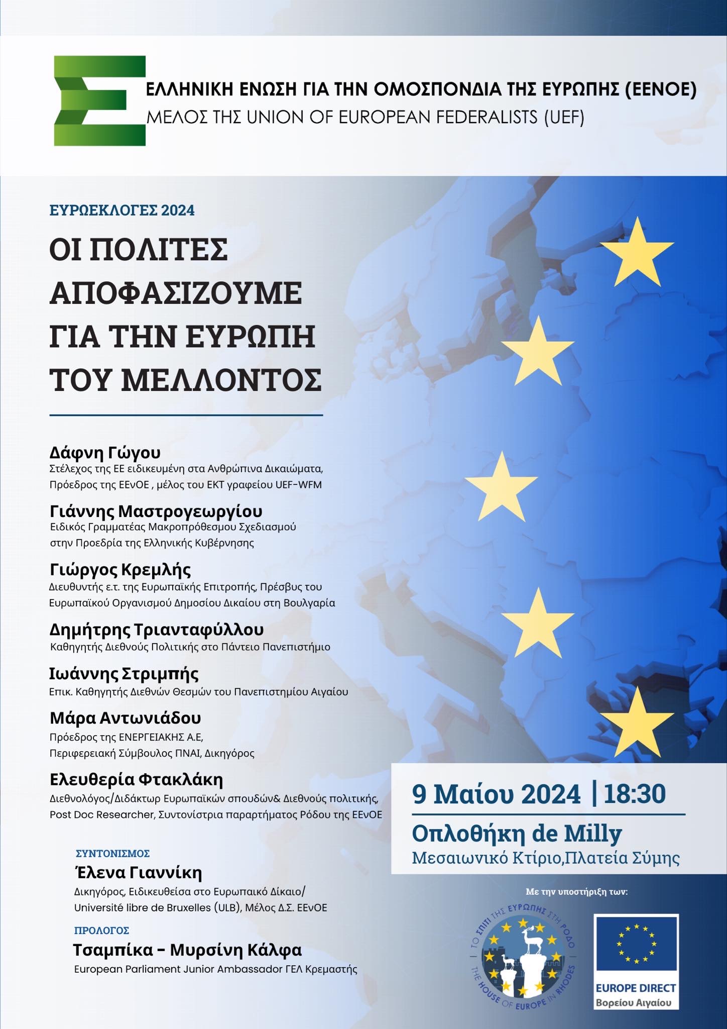 Στις 9 Μαΐου, την Ημέρα της Ευρώπης, από την ιστορική και την κοσμοπολίτικη Ρόδο, το νοτιότερο άκρο της Ευρωπαϊκής Ένωσης , σας προσκαλούμε να συμμετέχετε στην εκδήλωση που διοργανώνουμε με θέμα ΕΥΡΩΕΚΛΟΓΕΣ 2024: ΟΙ ΠΟΛΙΤΕΣ ΑΠΟΦΑΣΙΖΟΥΜΕ ΓΙΑ ΤΗΝ ΕΥΡΩΠΗ ΤΟΥ ΜΕΛΛΟΝΤΟΣ» Μια ισχυρή Ένωση που προστατεύει και συμβάλει στην παγκόσμια Ειρήνη και στην αειφόρο ανάπτυξη, για να συζητήσουμε μαζί την πορεία της Ευρωπαϊκής Ένωσης που απ’ ότι φαίνεται μας αφορά περισσότερο από ποτέ.