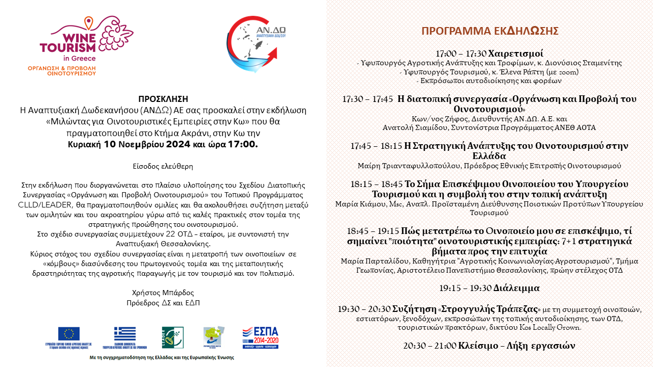 Η Αναπτυξιακή Δωδεκανήσου (ΑΝΔΩ) ΑΕ σας προσκαλεί στην εκδήλωση «Μιλώντας για Οινοτουριστικές Εμπειρίες στην Κω» που θα πραγματοποιηθεί στο Κτήμα Ακράνι, στην Κω την